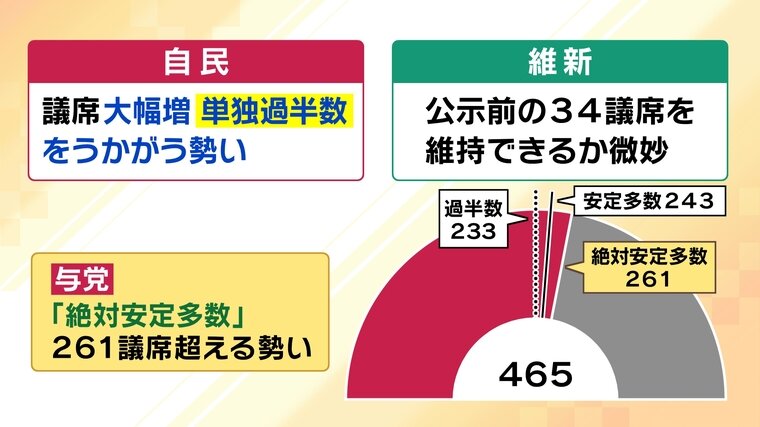 衆議院の議席数は465。高市総理は解散にあたり、その過半数である233議席を「勝敗ライン」としていましたが、序盤情勢で自民・維新の連立与党はそれを超えて「絶対安定多数」261議席を超える勢いを見せています。