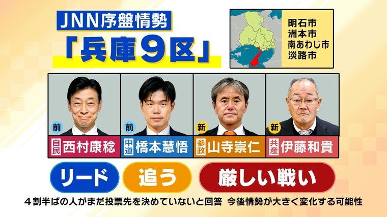 兵庫県明石市、洲本市、南あわじ市、淡路市の兵庫9区では、自民前職の西村康稔さんがリードし、中道の橋本さんが追う展開です。