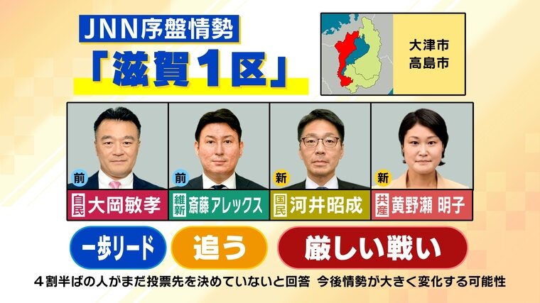 滋賀県の大津市と高島市から成る滋賀1区。自民前職の大岡敏孝さんが一歩リードし、維新前職の斎藤アレックスさんが追う形となっています。