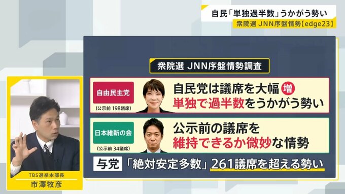 一方、連立を組む日本維新の会は公示前の34議席を維持できるかが微妙な情勢だ。ただ、市澤デスクは自民党と維新の会を合わせた与党としては、「絶対安定多数」の261議席を超える勢いだと指摘する。
