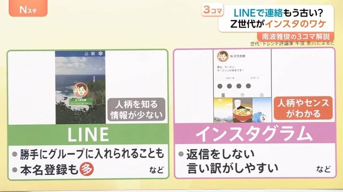 世代・トレンド評論家の牛窪恵さんによると、Z世代がインスタを使う理由は「相手を知りたい気持ちはあるが、一方で警戒もしている」ということです。