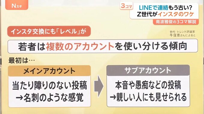世代・トレンド評論家の牛窪恵さんによると、「若者は複数のアカウントを使い分ける傾向」にあるといいます。