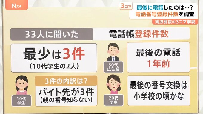 50代の広告業の方も「最後の電話は1年前」、20代の学生の方は「最後の番号交換は小学生の頃かな」ということでした。