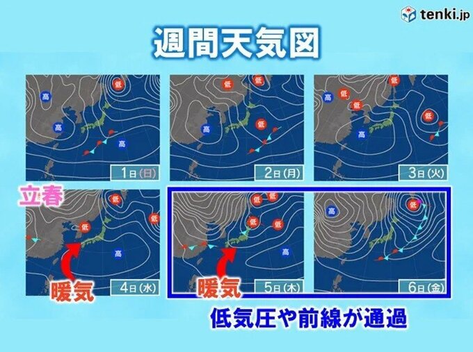 週明けにかけ、日本付近を覆っていた強い冬型の気圧配置が次第に緩む見込みです。この週末は北日本を中心に寒気の影響が残りますが、立春(4日)頃にかけては移動性の高気圧が日本の南から張り出し、全国的に気温が上昇する傾向となります。来週後半は気圧の谷が通過するため、天気は周期的に変化し、一時的に天気が崩れる所もありそうです。