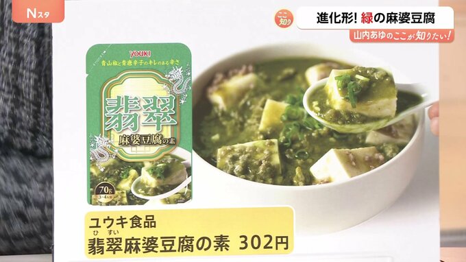 「麻婆豆腐TOKYO」では白や黄色の麻婆豆腐を提供していましたが、ユウキ食品は緑の「翡翠麻婆豆腐の素」(302円)を販売しています。青山椒とほうれん草で緑にしているということです。