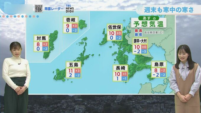 朝の冷え込みも強まります。島原・諫早・大村では-2度まで下がる予想で、その他の地域も0度~2度と厳しい冷え込みとなります。最高気温は両日とも8度~11度の予想。土曜日はきょうよりもやや高くなるところが多い見込みですが、雲が日差しを遮る時間帯は真冬らしい寒さが続くため、外出時は暖かい服装でしっかりと防寒を行ってください。