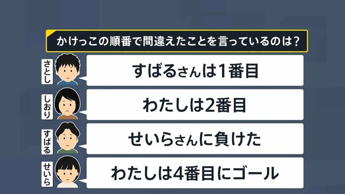 Q.かけっこをした4人のうち、順位について1人だけ間違ったことを言っている人がいます。誰でしょう?