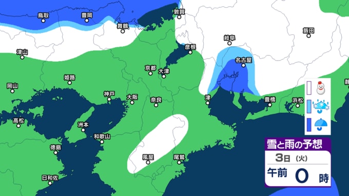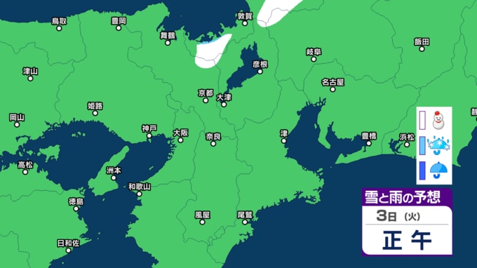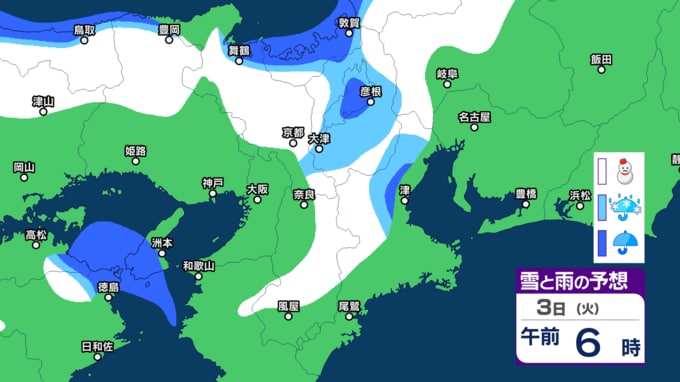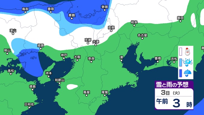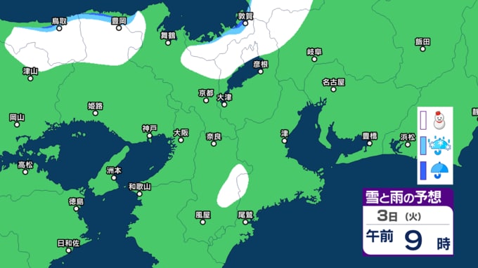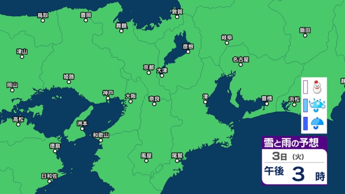 【関西の雪】近畿地方(大阪・京都・神戸・滋賀・奈良・和歌山)の雪雨シミュレーション【気象庁/31日】 RSK山陽放送 2026年1月31日(土) 10:00 国内 天気 3日(火) シミュレーションでは、2日夜から3日午前にかけて雪雲がかかっています。 (予想にはブレ幅がありますので、最新の気象情報を確認してください)