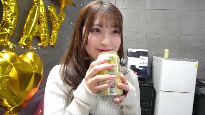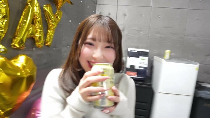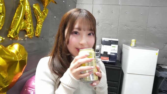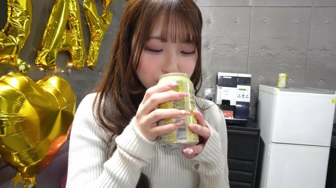 動画では、HAPPY BIRTHDAYのゴールドのバルーンで飾られていると思われる練習部屋の一角で、桜庭さんがレモンサワーの缶を両手で抱えて、おずおずと一口飲んでみています。