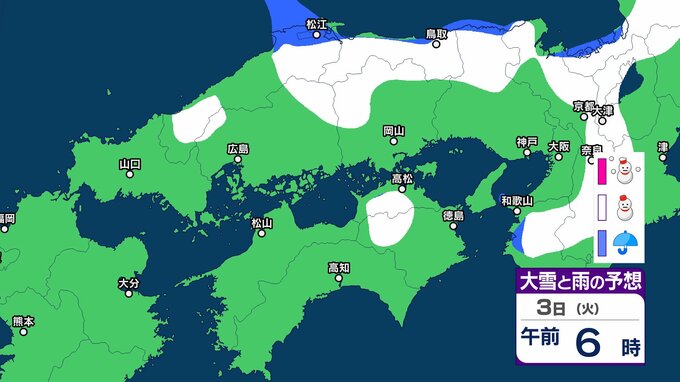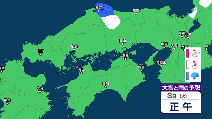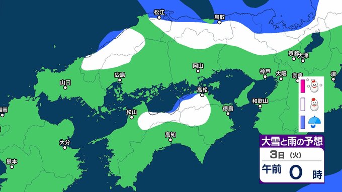 【雪】中国・四国地方の今後の雪は? 広島・岡山・山口・鳥取・島根・香川・愛媛・高知・徳島 1月31日(土)~2月5日(木)までの雪雨シミュレーション【気象庁 /31日午後6時更新】 RSK山陽放送 2026年1月31日(土) 18:00 国内 天気 3日(火) 2日夜から3日午前にかけて前線が通過するため、中国地方、四国地方に雪雲が広がるでしょう。 20 21 22 23 24 25 26 27