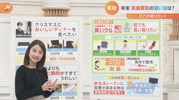 この時期に狙い目なのはどういうものかというと、新生活シーズンに需要が高まる物は買取価格も高くなる可能性があるということで、年末ですけれども、既に3月4月に向けたものというのが今、人気で狙い目なのだそうです。単身用の家具や家電などが高く値がつくのではないかということでしたね。