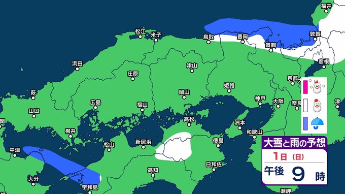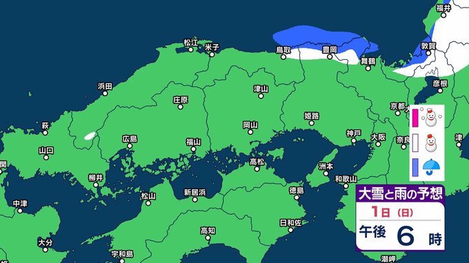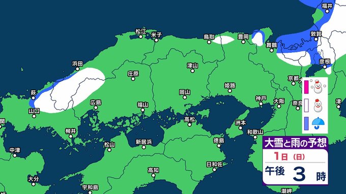1日の広島県は、寒気や湿った空気の影響でおおむね曇り、北部では雪の降る所がある見込みです。