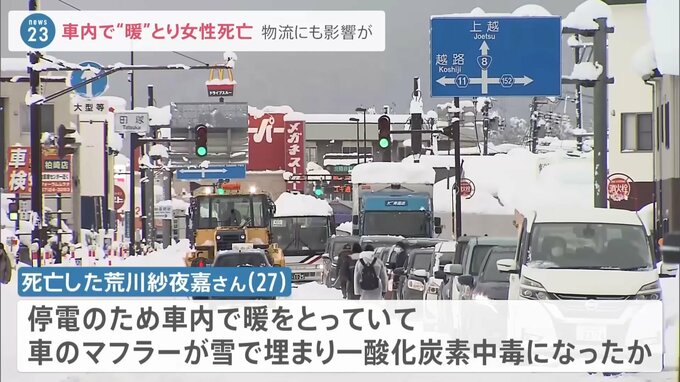 この大雪で命を落とした人も。20日午後、柏崎市で雪に埋まった車両の中で女性が見つかり、死亡が確認されました。この地域は19日から停電していました。警察によりますと女性は車内で暖をとっていましたが、車のマフラーが雪で埋まり一酸化炭素中毒になった疑いがあるということです。