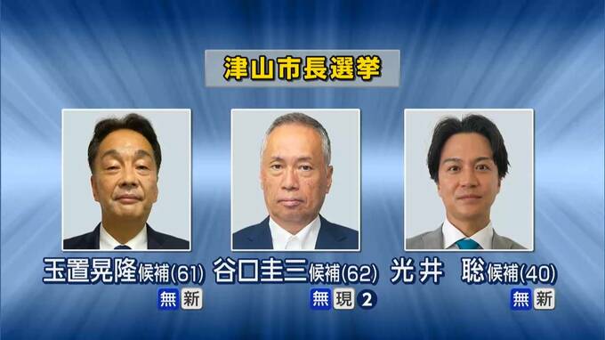 津山市長選挙に立候補したのは、届け出順に、元津山市総務部長で新人の玉置晃隆氏、現職で3回目の当選を目指す谷口圭三氏、医師で新人の光井聡氏の3人です。