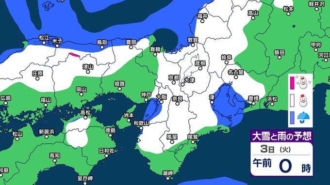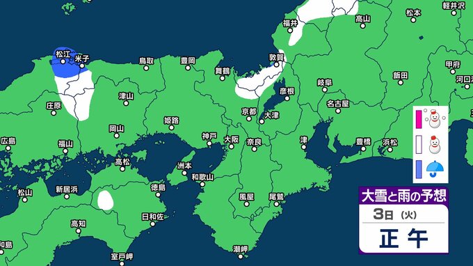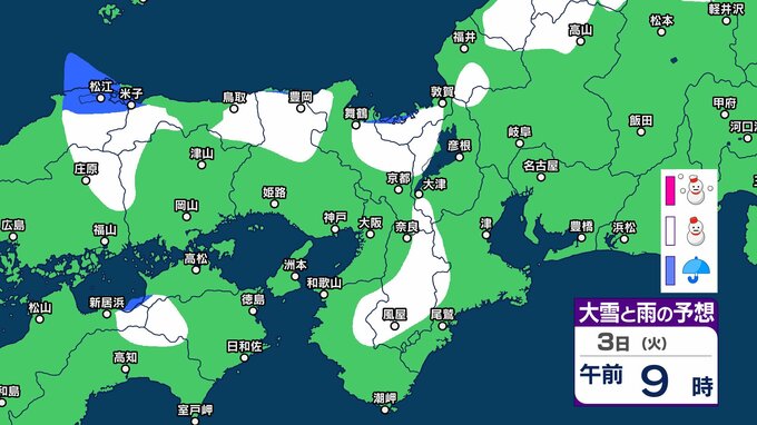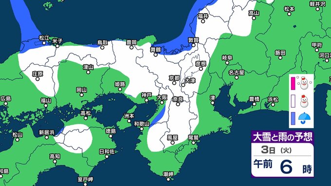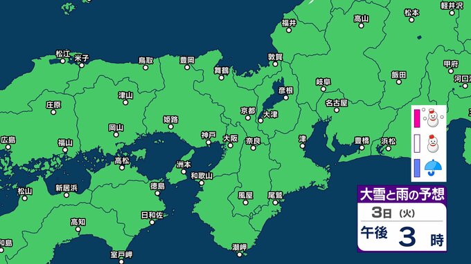 【関西の雪】近畿地方(大阪・京都・兵庫・滋賀・奈良・和歌山)の雪雨シミュレーションと16日間天気予報【気象庁/2月1日】 RSK山陽放送 2026年2月1日(日) 11:28 国内 天気 3日(火) 1~3日の雪雨シミュレーション・16日間天気予報