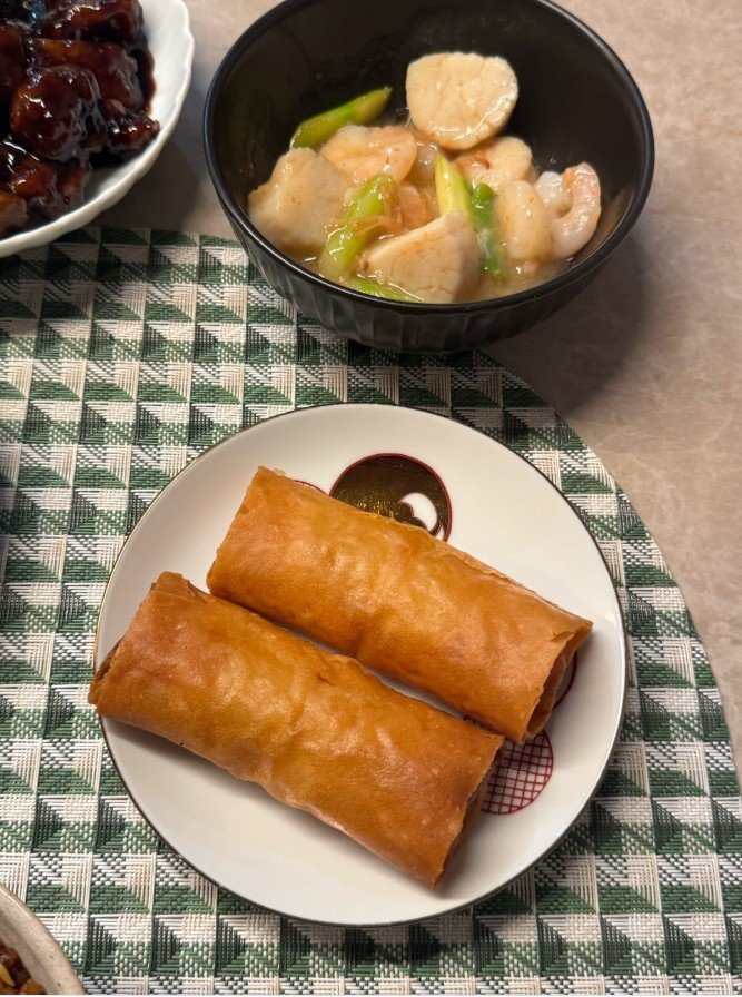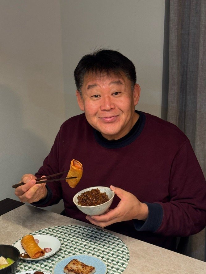 また別の写真では、花田さん自身がワインレッドのトレーナーを着て箸で春巻きをつまんでいる姿も公開されており、穏やかな微笑みで満足そうな表情を見せています。