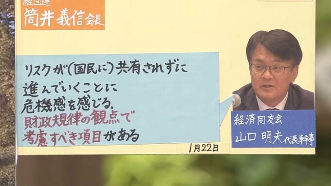 経済同友会の山口明夫代表幹事も「リスクが(国民に)共有されずに進んでいくことに危機感を感じる。財政規律の観点で考慮すべき項目がある」として、各党に説明を尽くすよう注文を付けています。
