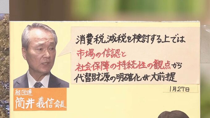 減税一色となるなか、経済界からはクギをさす声も上がっています。経団連の筒井義信会長は「消費税減税を検討する上では、市場の信認と社会保障の持続性の観点から、代替財源の明確化が大前提」と話しています。