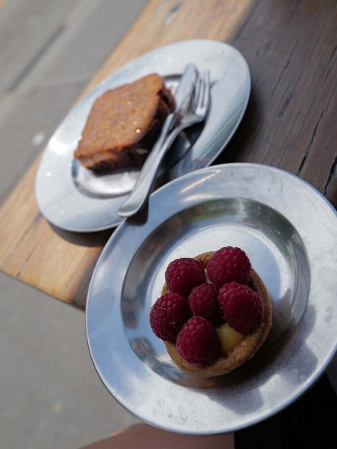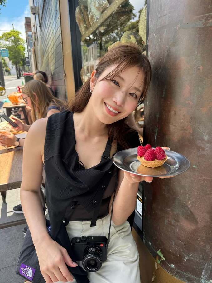 カフェでの食事も楽しんだ様子で、ショーケースに並ぶラズベリーをたっぷり乗せたタルトや焼き菓子などのデザートを堪能している写真も投稿されています。