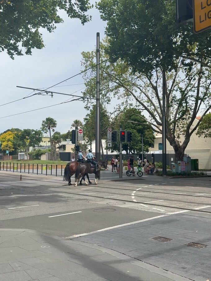 投稿された写真からは、サリーヒルズの特徴的な風景が伝わってきます。赤色の路面電車が走る街並みや、黄色い建物と青空のコントラストが印象的です。また、街中では騎馬警察が馬に乗って横断歩道を渡る海外ならではの光景も撮影されていました。