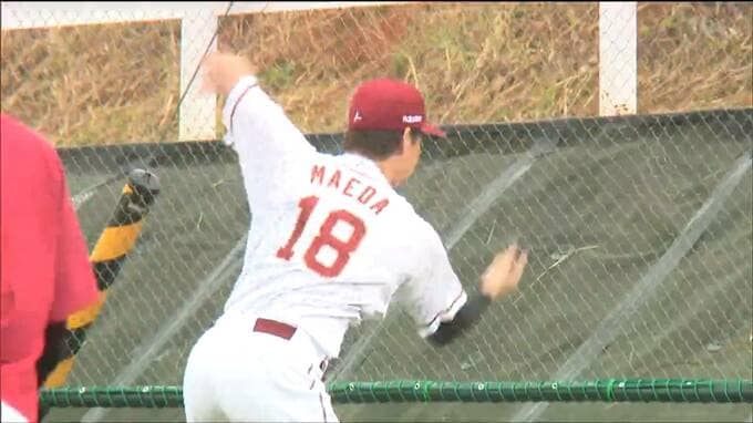 今年も沖縄県・金武町で始まった春季キャンプ。日本球界復帰で注目を集める前田健太投手は背番号18のユニフォーム姿で登場!キャッチボールを終えるとこのキャンプ一番乗りでブルペンへ。感触を確かめながら全球ストレートで背番号と同じ18球。力強いボールを投げ込んでいました。
