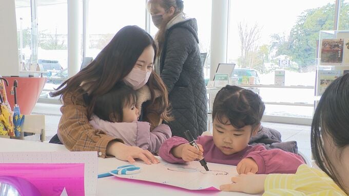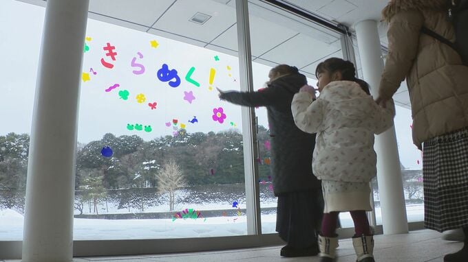 美大生と一緒にカラーフィルムの切り絵を作れるワークショップでは、参加者が作った作品をガラス窓に楽しそうに貼る姿が見られました。