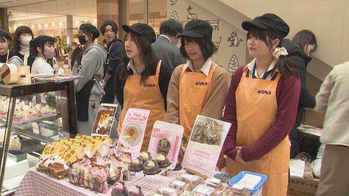 今月14日のバレンタインデーを前に、県内でマーケティングを学ぶ学生が考案したバレンタイン向けのスイーツを販売するイベントが山形村で行われました。