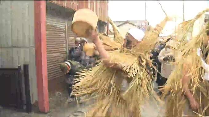 火伏せの奇祭「米川(よねかわ)の水かぶり」が宮城県登米市で行われ、稲わらを身にまとった男性たちが、家々に水をかけてまわりました。