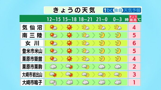■登米市米山:5℃ ■栗原市築館:4℃ ■栗原市栗駒:2℃
