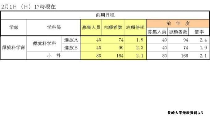 【長崎大入試2026】前期倍率は2.2倍 10学部中8学部でダウン 最難関・医学部は1.5ポイント減の4.4倍【全学部掲載】 長崎放送 2026年2月2日(月) 12:00 国内 環境科学部は2.1倍 前年度と同倍率に ▶環境科学部の志願倍率は2.1倍 …前年度と同じ倍率となりました。選抜A、選抜Bの各志願状況は【画像⑩】で確認してください。 ◆【画像を見る】長崎大学志願状況/全学部掲載 ◆この記事を最初から読む