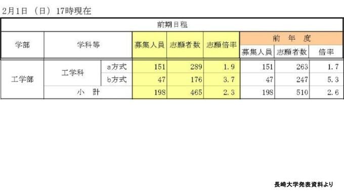 【長崎大入試2026】前期倍率は2.2倍 10学部中8学部でダウン 最難関・医学部は1.5ポイント減の4.4倍【全学部掲載】 長崎放送 2026年2月2日(月) 12:00 国内 工学部は2.3倍 前年度から0.3ポイント低下 ▶工学部の志願倍率は2.3倍(全体) …b方式の志願倍率は3.7倍と高倍率になっています。ただし前年度の5.3倍からは1.6ポイント低下しました。詳しい志願状況は【画像③】から確認してください。 ◆【画像を見る】長崎大学志願状況/全学部掲載 ◆この記事を最初から読む