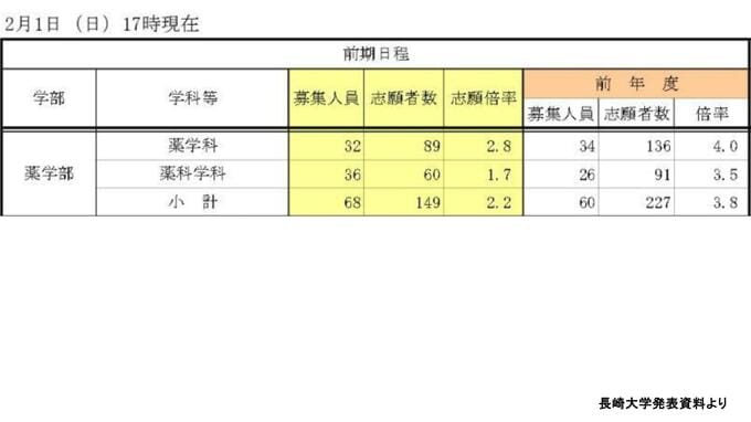 【長崎大入試2026】前期倍率は2.2倍 10学部中8学部でダウン 最難関・医学部は1.5ポイント減の4.4倍【全学部掲載】 長崎放送 2026年2月2日(月) 12:00 国内 薬学科は2.8倍 前年度比1.2ポイント低下 ▶薬学部(薬学科)志願倍率は2.8倍 …前年度の4.0倍から1.2ポイント低下しています。学部の詳しい志願状況は【画像⑥】から確認してください。 ◆【画像を見る】長崎大学志願状況/全学部掲載 ◆この記事を最初から読む