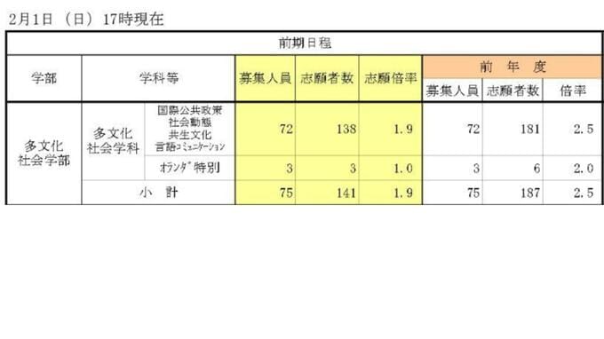 【長崎大入試2026】前期倍率は2.2倍 10学部中8学部でダウン 最難関・医学部は1.5ポイント減の4.4倍【全学部掲載】 長崎放送 2026年2月2日(月) 12:00 国内 多文化社会学部 前年度から0.6ポイント低下 ▶多文化社会学部の志願倍率は1.9倍 …前年度から0.6ポイント低下しています。コース別の志願状況は【画像⑧】で確認してください。 ◆【画像を見る】長崎大学志願状況/全学部掲載 ◆この記事を最初から読む