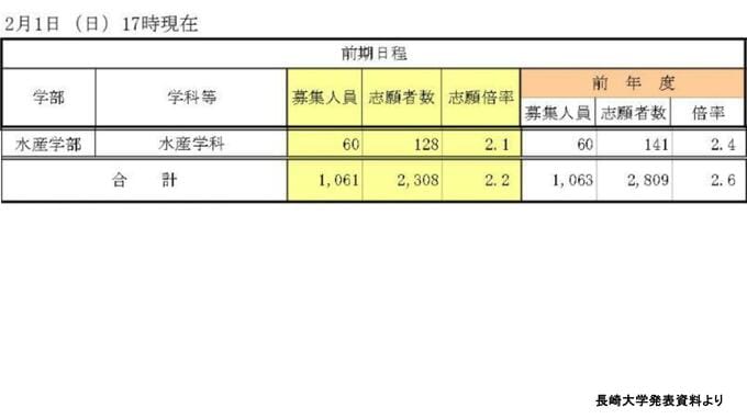 【長崎大入試2026】前期倍率は2.2倍 10学部中8学部でダウン 最難関・医学部は1.5ポイント減の4.4倍【全学部掲載】 長崎放送 2026年2月2日(月) 12:00 国内 水産学部 前年度から0.3ポイント減 ▶水産学部の志願倍率は2.1倍 …前年度から0.3ポイント低下しました。【画像⑨】 ◆【画像を見る】長崎大学志願状況/全学部掲載 ◆この記事を最初から読む