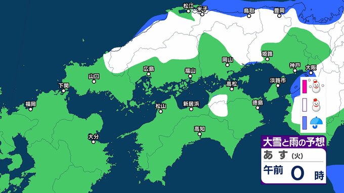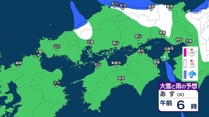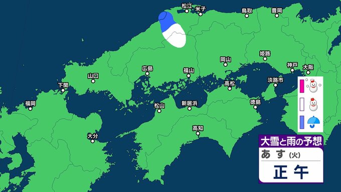 島根県は、寒気や湿った空気の影響で曇り、未明は雪や雨が降るでしょう。雷を伴う所がある見込みです。夕方からは高気圧に覆われておおむね晴れるでしょう。