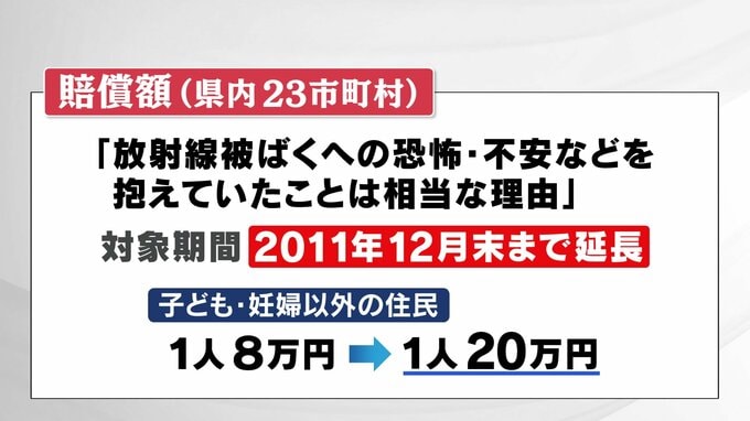 これまで、子ども・妊婦以外の自主避難者への賠償は、原発事故当初の時期の損害としていましたが、「放射線被ばくへの恐怖・不安などを抱えていたことは相当な理由」として、賠償の対象期間は2011年12月末まで延長されています。