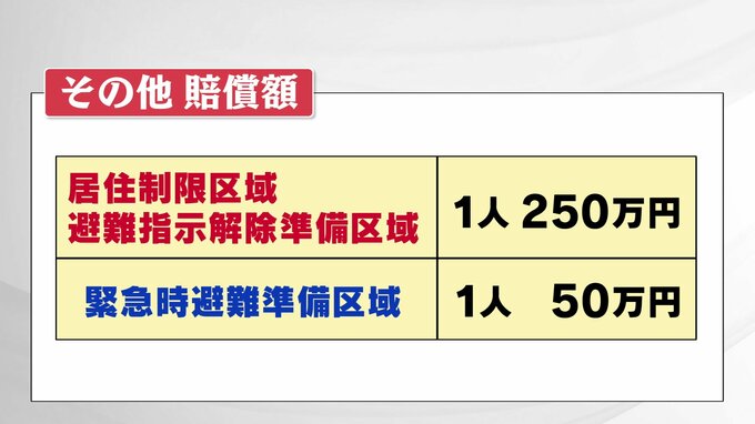 また、新しい指針では、生活基盤が変容したことへの慰謝料として「居住制限区域」と「避難指示解除準備区域」の住民に1人あたり250万円、そして「緊急時避難準備区域」には、50万円の賠償を認めることを決めています。