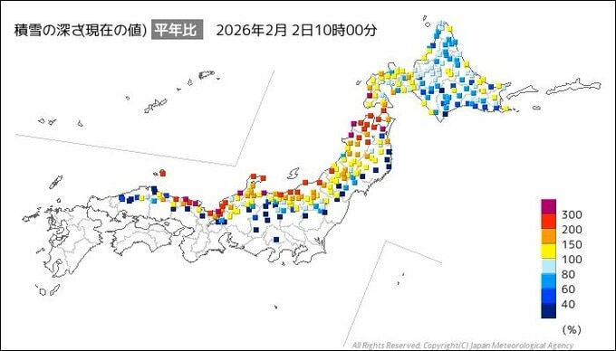 青森では1日午後3時の積雪が183cmに達し、1893年の観測開始以降、年ごとの最深積雪としては観測史上4位の記録的な豪雪となっています。もともと雪の多い青森県や秋田県ですが平年の3倍以上の積雪となっている所もあります。この寒波は3日(火)には冬型の気圧配置が緩むとともに次第に抜けていき、4日(水)には日本の南海上に移動性の高気圧が進んでくるため暖かな空気が流れ込み、「立春」に合わせるように全国的に気温が平年より高くなる見込みです。