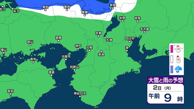 滋賀県は、南部では高気圧に覆われておおむね晴れますが、北部では低気圧や湿った空気の影響でおおむね曇り、北部を中心に夜遅くは雪や雨が降るでしょう。夕方からは雷を伴う所がある見込みです。