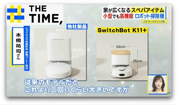 「SwitchBot ロボット掃除機 K11+」(5万9800円※取材時)は、集じんステーションの大きさが幅24×奥行18×高さ25cmと、設置面積が“A4用紙にすっぽり収まる”コンパクトさ。