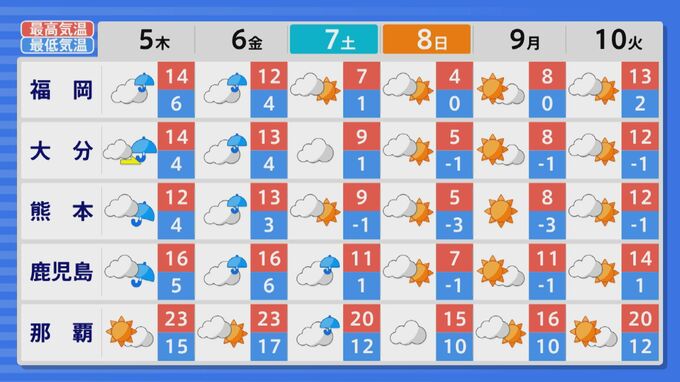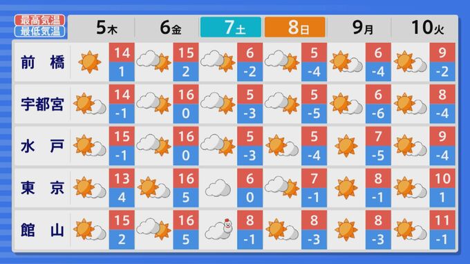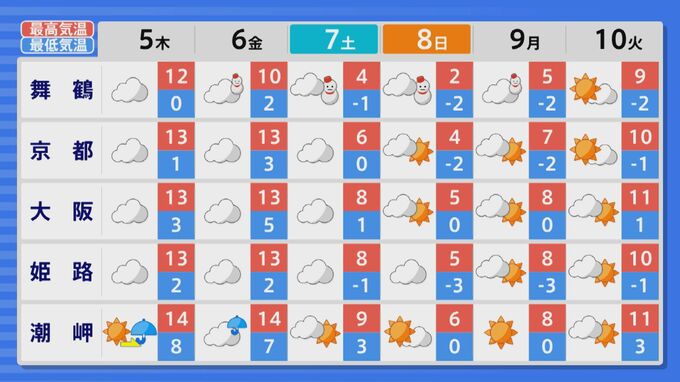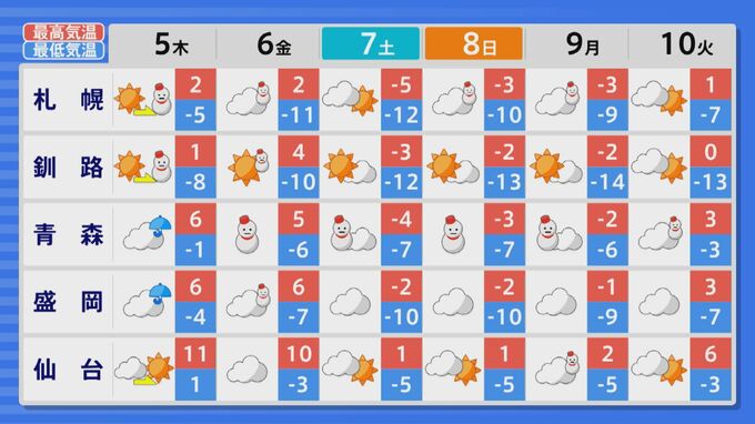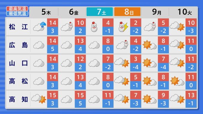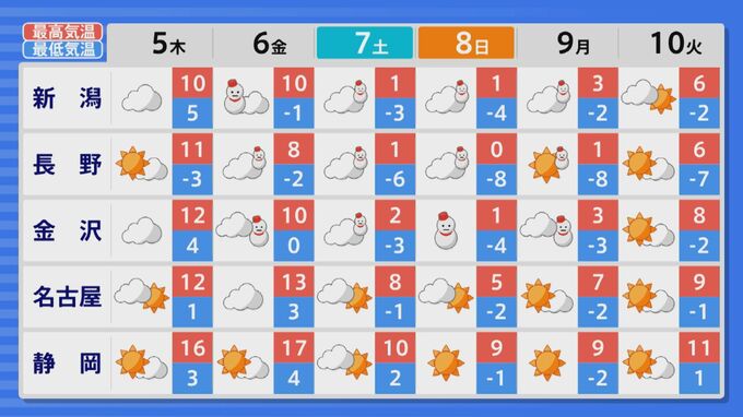 各地の週間予報です。週末は日本海側では雪の降り方が強まるところがあるでしょう。