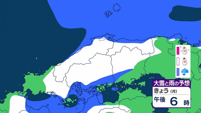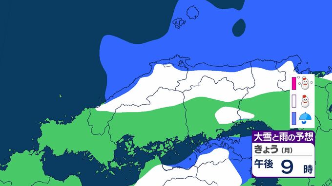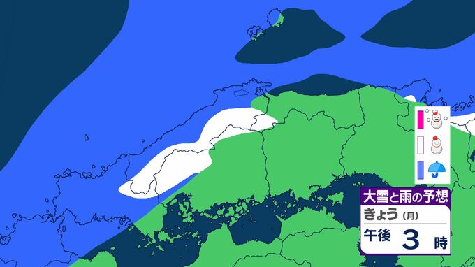 広島県は、気圧の谷や寒気の影響でおおむね曇り、北部では夕方から雪や雨が降るでしょう。雷を伴う所がある見込みです。南部でも夕方は雨や雪が降るでしょう。