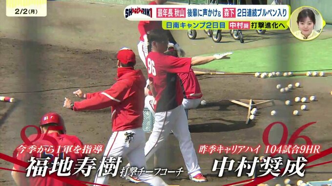 その中村奨成はバッティング練習で昨シーズン、飛躍のきっかけを作った福地コーチから連日の打撃指導を受けます。