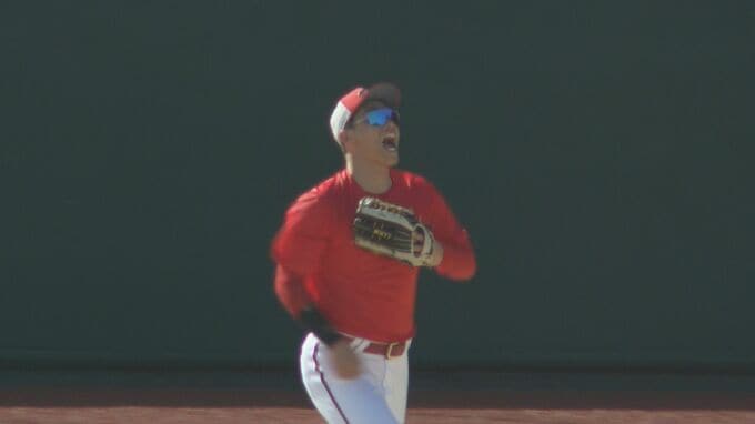 ことしの春季キャンプでは野手と投手が一緒にウオーミングアップします。この時間を「勝つために重要なプレーを共有するために使いたい」と語った秋山。外野のレギュラーを争う後輩とも積極的に言葉を交わします。