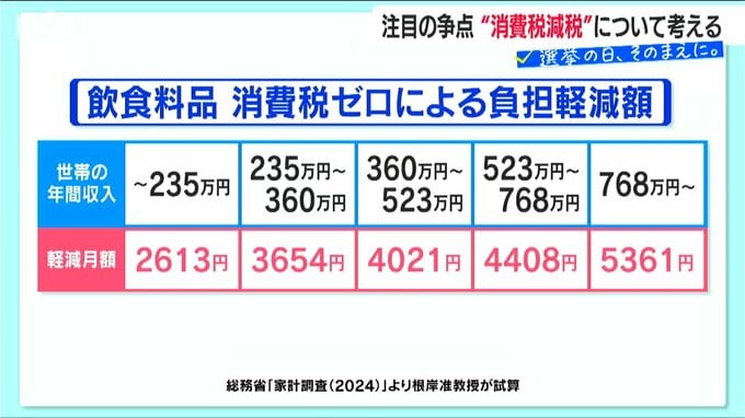 総務省の家計調査から根岸 准教授が出した試算によりますと、食料品の消費税がゼロになった場合、一か月当たり低所得世帯ではおよそ2600円、高所得世帯でおよそ5300円、平均するとおよそ4000円の負担軽減が期待できるとしています。