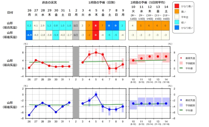 ・最近1週間の実況と今後2週間先までの気温の推移を表示しています。