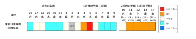 ・2週目の予報は中心の日に前後2日間を加えた5日間の平均(最高気温の5日間平均、最低気温の5日間平均、平均気温の5日間平均)です。平均期間を中心の日の下に表示しています。2週目のかなり高い(かなり低い)は、かなり高い(かなり低い)気温となる確率が30%以上のときに表示します。