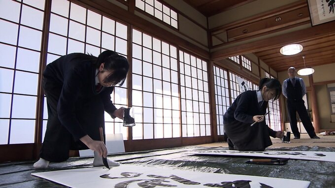 今年で517回目となる西大寺会陽です。事始めを前に行われた書初め式では、瀬戸内市の書家、奥田雄山さんが勢いのある年になるようにと「万馬奔騰(ばんば・ほんとう)」としたためました。その後、弟子で岡山学芸館高校2年の岡田亜美さんと大森優衣さんが会陽の無事の開催を願って一文字ずつ綴りました。