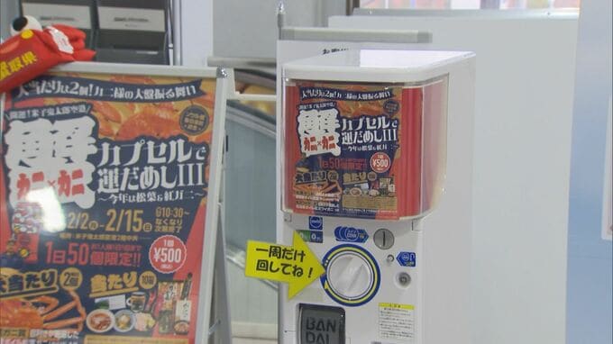 皆さんの目当ては、1回500円で回せるガチャ。当たり賞品は、1万円相当の松葉がにと、2枚で7000円相当のベニズワイガニです。