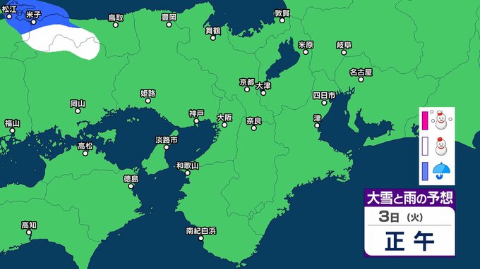 滋賀県は、寒気や湿った空気の影響で曇り、北部を中心に明け方まで雷を伴って雪や雨が降るでしょう。夕方からは高気圧に覆われて晴れる見込みです。